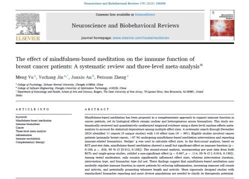Yu, M., Jin, Y., An, J., & Zheng, P. (2025). The Effect of Mindfulness-Based Meditation on the Immune Function of Breast Cancer Patients: A Systematic Review and Three-Level Meta-Analysis. Neuroscience & Biobehavioral Reviews, Volume 179, 106396. https://doi.org/10.1016/j.neubiorev.2025.106396