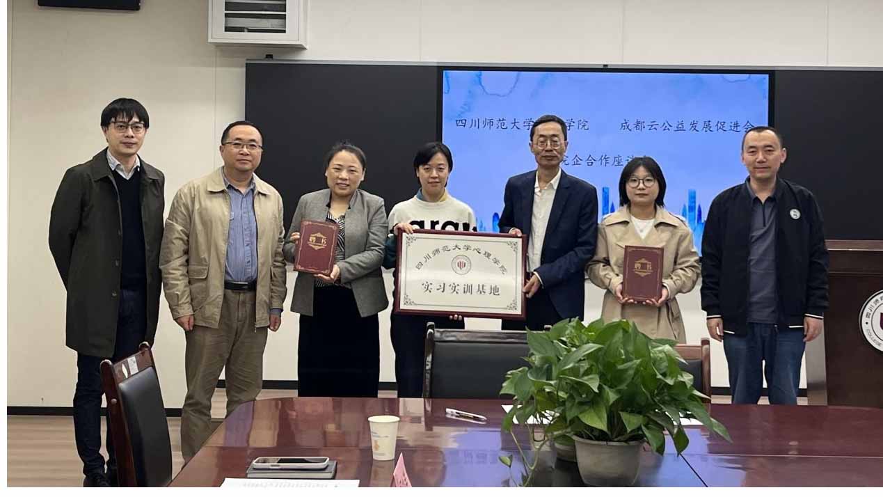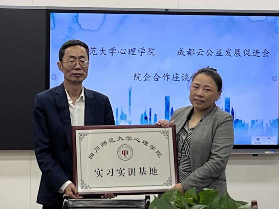 靳宇倡代表学院向成都云公益发展促进会授予《四川师范大学心理学院实习实训基地》牌匾。