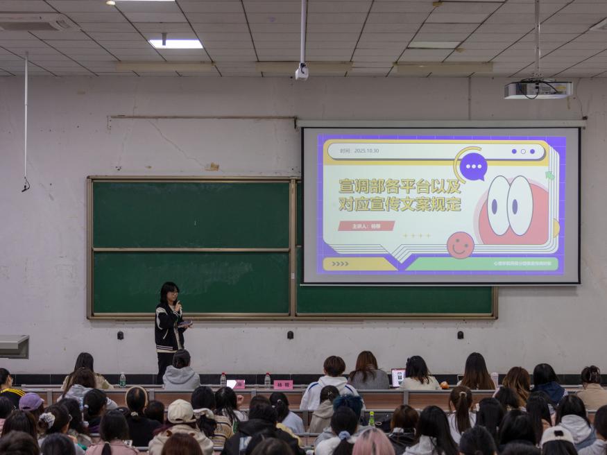 宣传调研部主要负责人杨柳介绍学院两委各类宣传平台上的内容规范与发布流程,具体讲解了不同平台的文案风格与审核标准,要求学员们树立宣传责任意识,共同塑造积极、专业的学院形象。